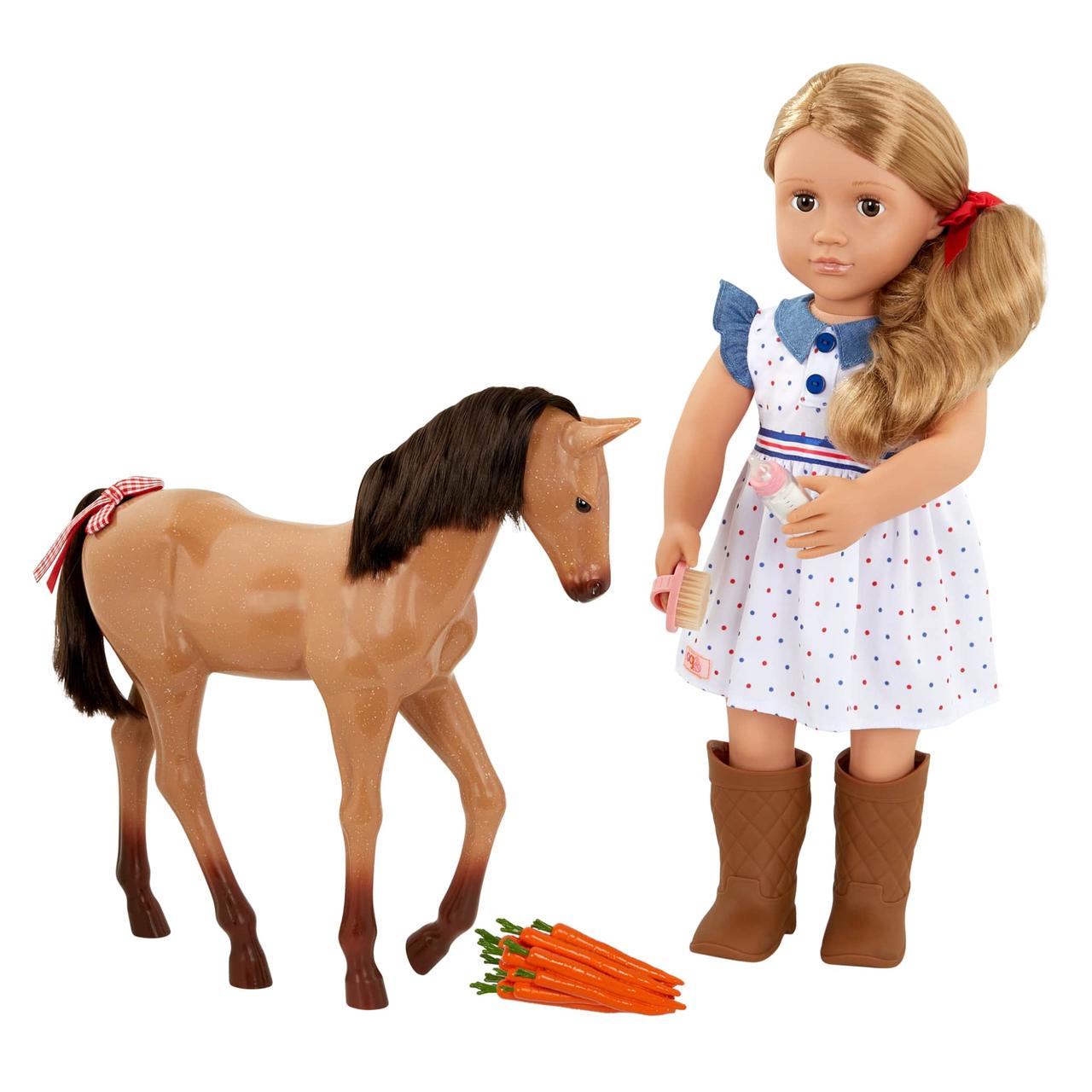Розширюйте своє ранчо та дізнавайтеся, як доглядати за новонародженим лошам разом із Шеллі! Лялька Our Generation заввишки 46 сантиметрів обожнює коней. Допоможіть їй піклуватися про лоша за допомогою пляшечки для годування, морквин і щіточки для догляду. А для ще більшої чарівності прикрасьте його стильним бантиком! Її лоша має блискуче покриття та шовковисту гриву й хвіст, які можна розчісувати та укладати.